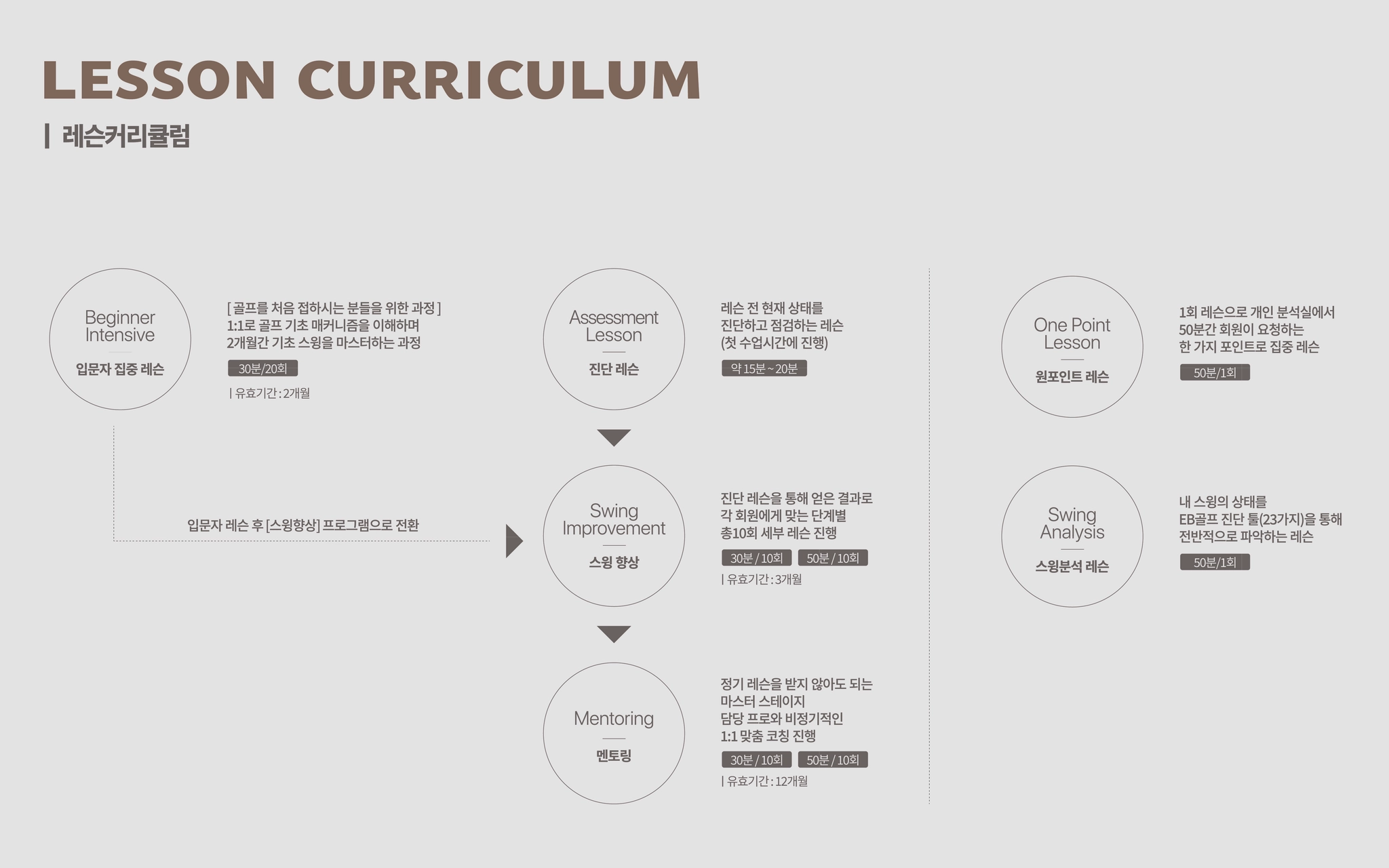 입문자→스윙향상→멘토링으로 이어지는 커리큘럼 (원포인트/스윙분석 레슨은 1회로 진행)